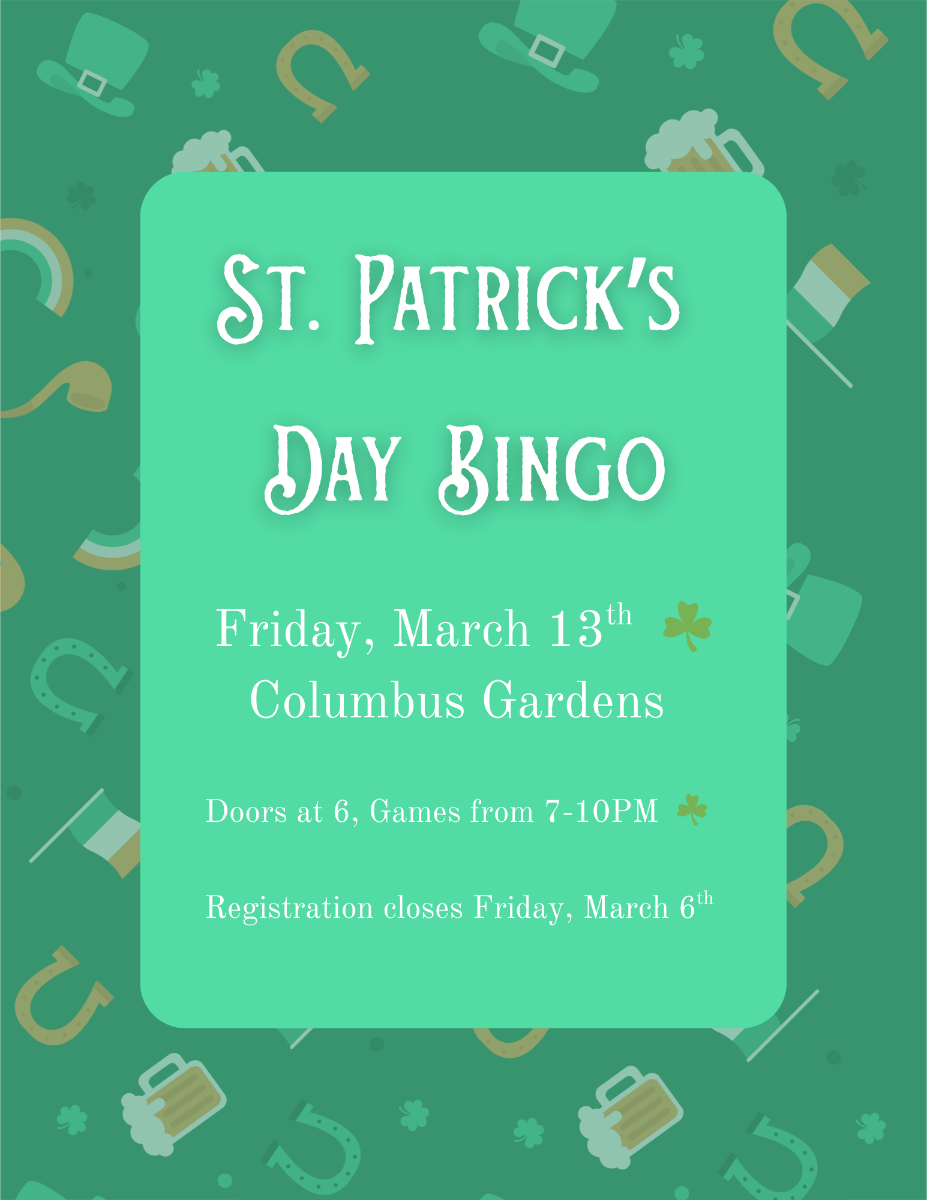 Help us celebrate St. Patrick's Day with BINGO at Columbus Gardens (4301 Klosterman Avenue, Nottingham MD) on Friday, March 13th! Doors open at 6pm; games start at 7pm.